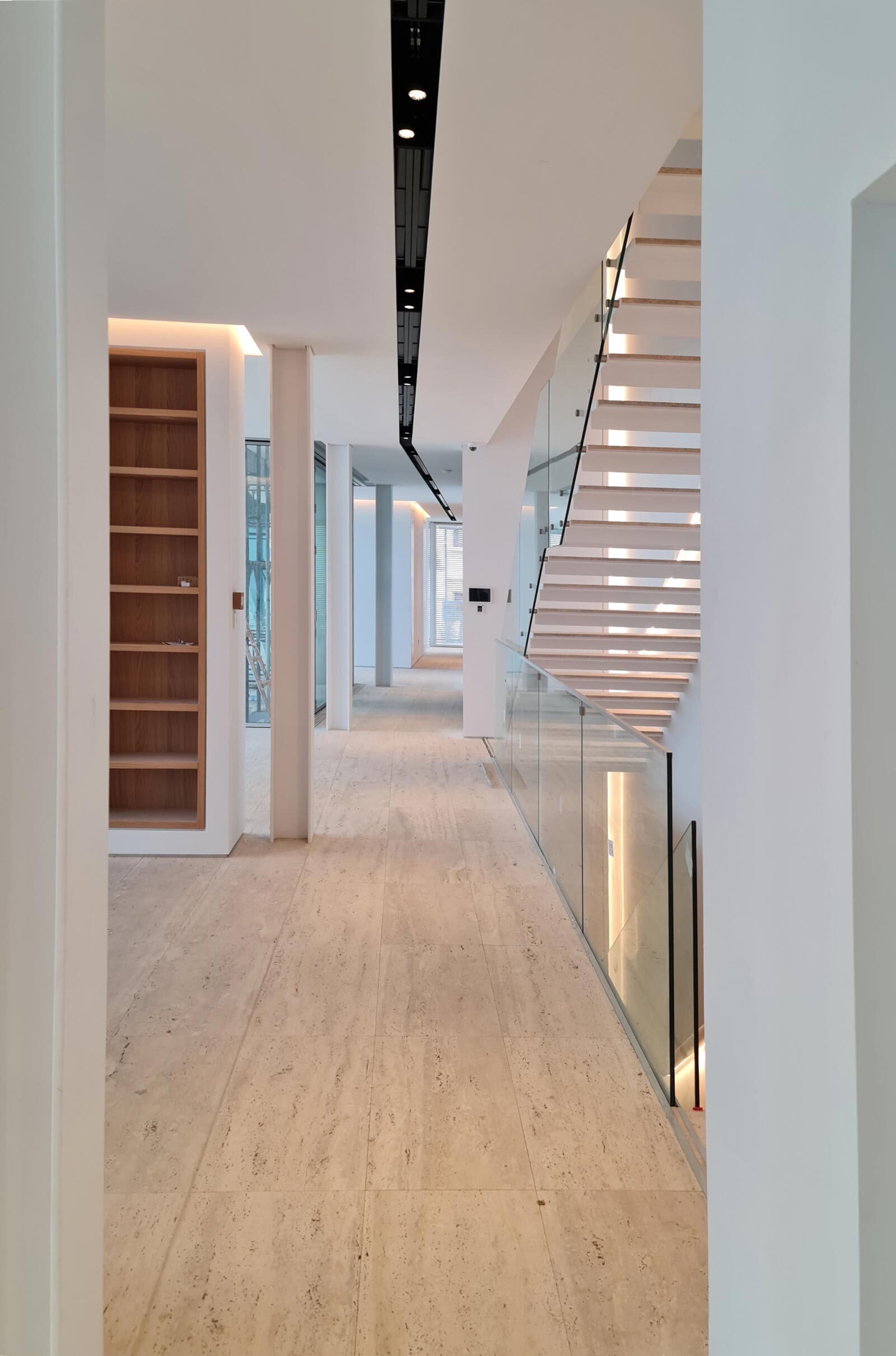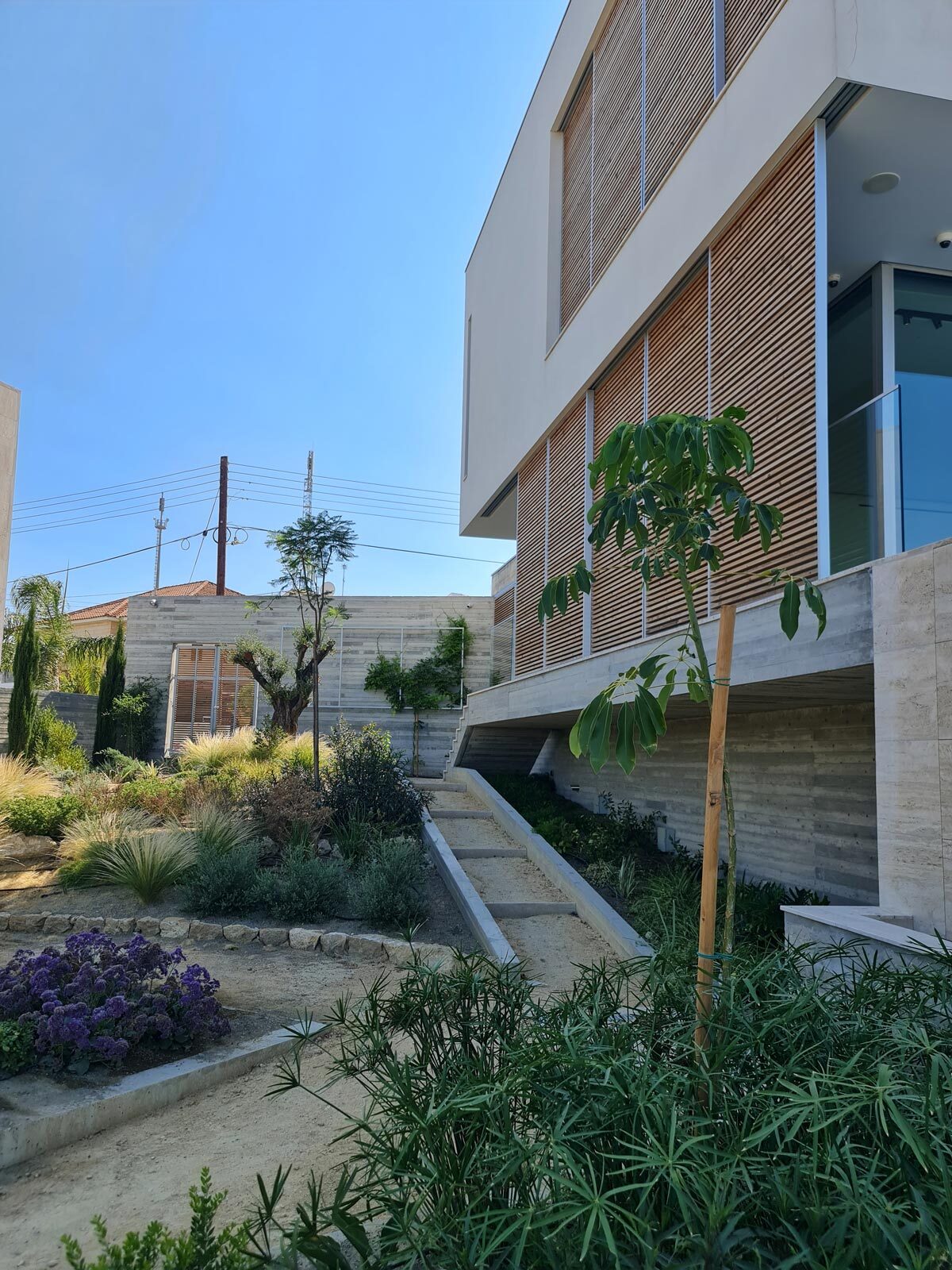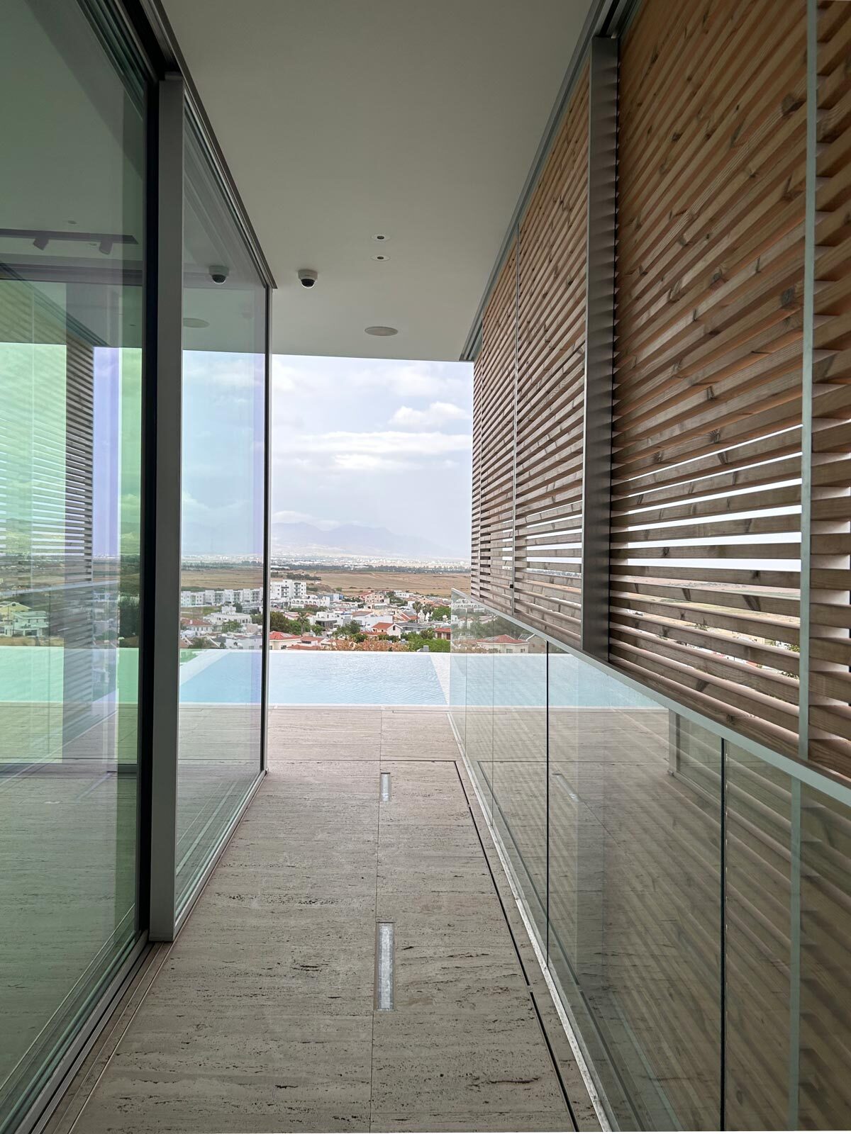 Positioned on a sloped terrain in Nicosia, the house extends this relationship even further, offering views toward the Pentadaktylos Mountains from every level, including the basement. An infinity‑edge pool reinforces this continuity, drawing the eye outward and merging the architecture with the horizon.