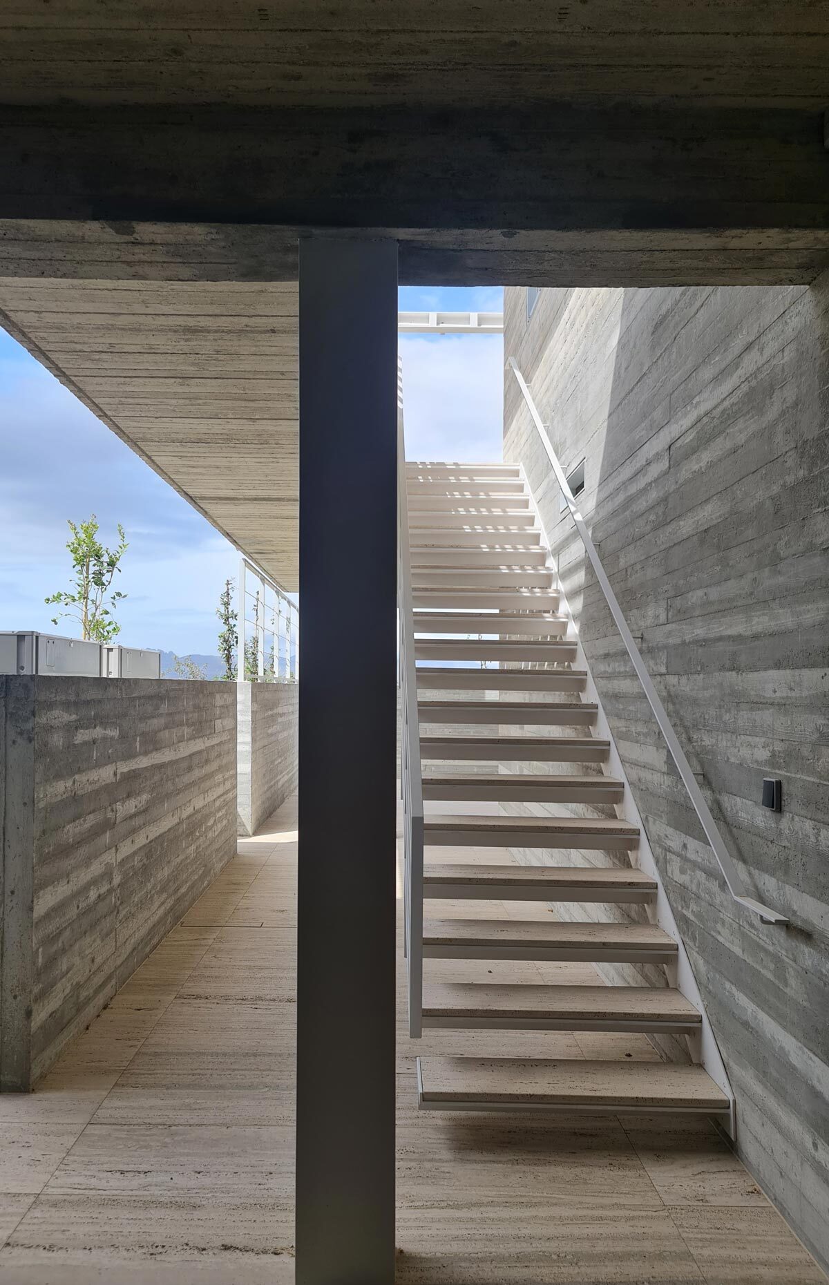 The structure combines reinforced concrete and steel. The basement and ground floor are formed in fair‑faced concrete, anchoring the building to the terrain with a solid, tactile presence. Above this, the first floor is constructed as a lightweight metal structure with dry‑wall partitions, creating a more flexible and open framework.